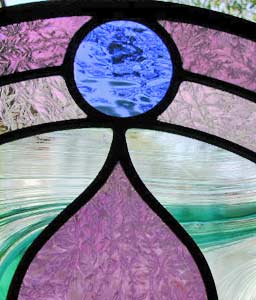 "Fleur de Lis Victorian Circle 2", Reminiscent of the Victorian period. This stained and leaded glass Fleur de Lis circle window was 24" in diameter.The borders were 2 shaded of mauve gluechip. The background was clear Baroque glass. The Fleur de Lis was mauve gluechip glass and the circles were teal Waterglass.Choose your own colors and sizes. |