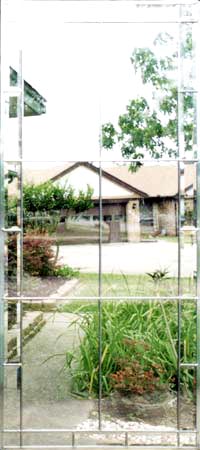 "PNLPG1" LEADED GLASS BEVEL WINDOW CUSTOM AT GLASS BY DESIGN.Leaded glass window can be most any size.This is a beveled glass border surrounding clear glass. Any color you see is what the camera saw through these glasses. The border was clear bevels and the panes were clear glass, but any glass would be great. Perhaps you would like a colored border. Choose your own colors and sizes. |